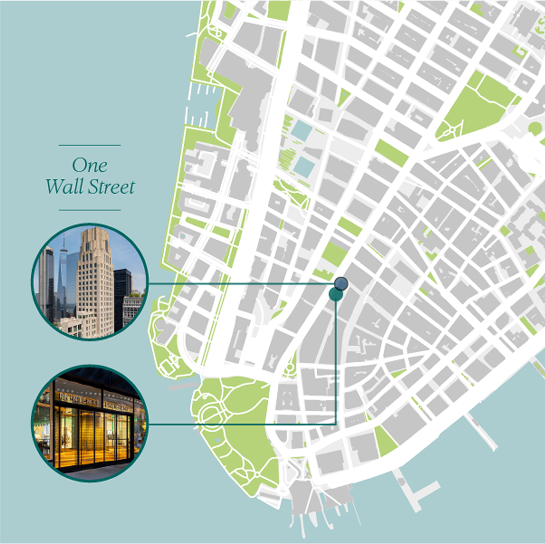 Maybourne Residences One Wall Street occupies the uppermost floors of Ralph Walker's Art Deco masterpiece, with seventeen exceptional residences designed by Michelle Wu. Residents benefit from Maybourne's global privileges whilst living in the heart of Manhattan's most dynamic neighbourhood.